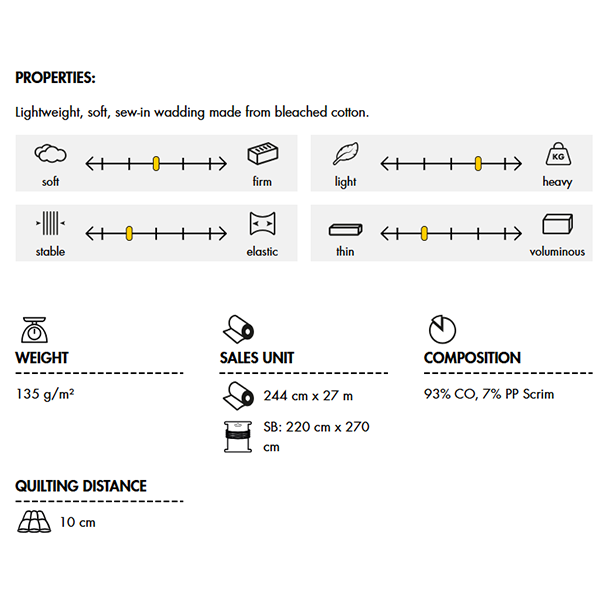 A lightweight, soft, sew-in wadding made from bleached cotton with scrim, allowing an excellent combination of a soft hand feel and a lightweight construction while still providing significant stability and support. Especially developed for quilts and light coloured fabrics but is also very well suitable for lightweight but warm jackets and coats.