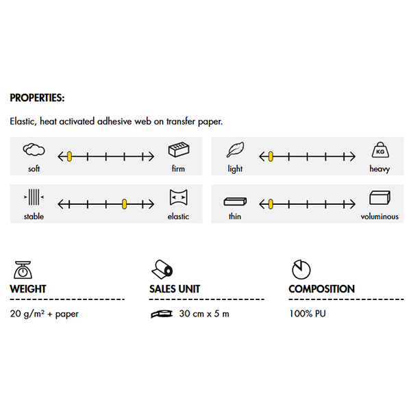 20 grams per metre² (plus paper weight). Made from 100% PU. Allows precise hemming without measuring. Washable up to 40 degrees