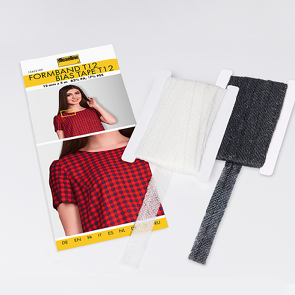 1. The bias tape is 12 mm wide and has a chain stitch at 4/8 mm from the edge. Iron on the tape in such a way that the 8 mm side meets the fabric edge and is sewn right behind the chain stitch.