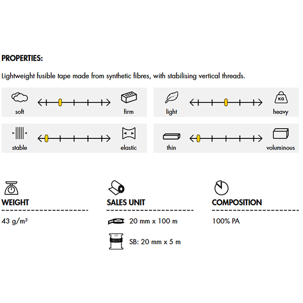 43 grams per metre². Made from 100% PA. Easy to iron on and retains perfect shape long term as it does not stretch. Washable up to 40 degrees